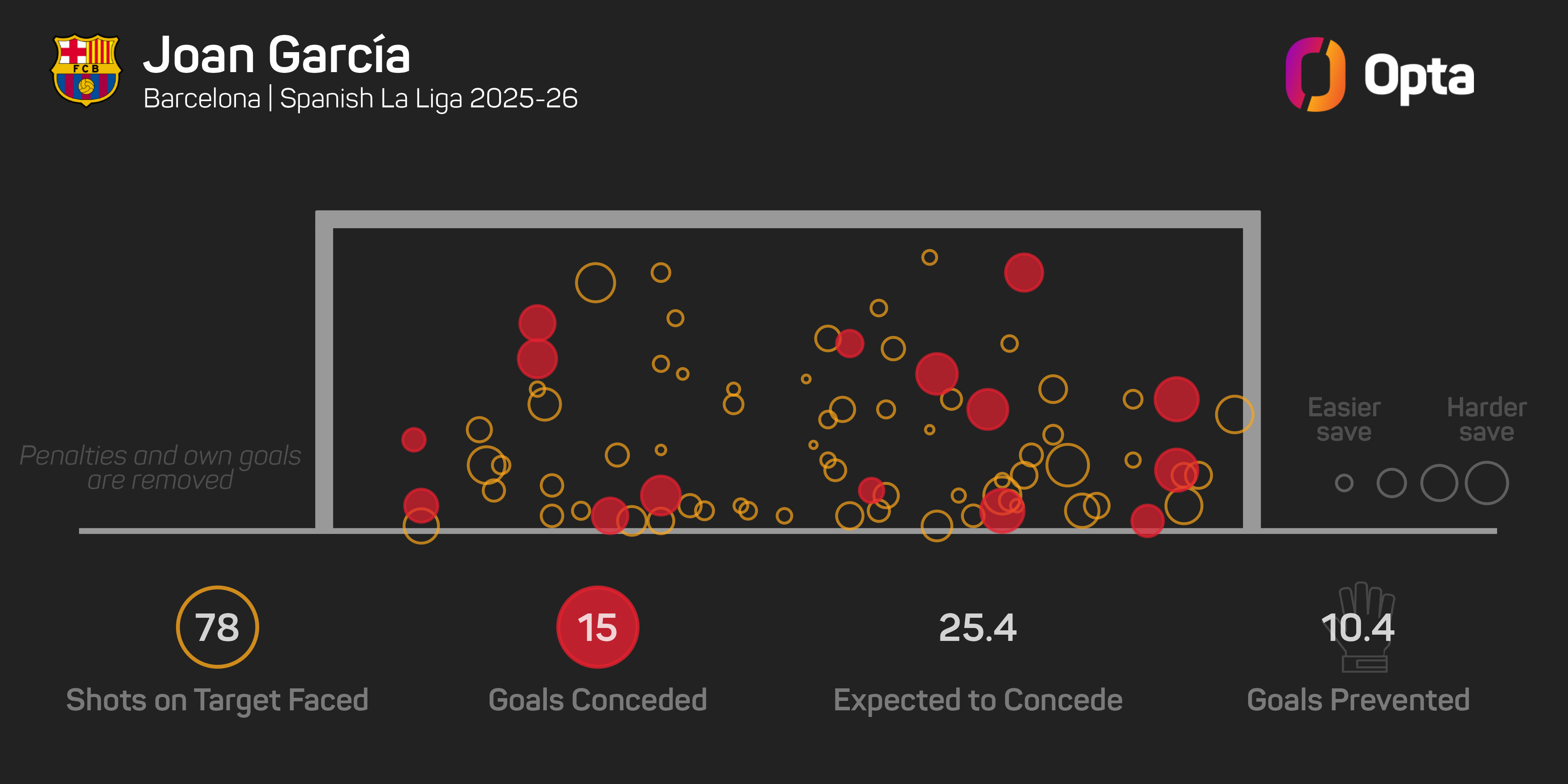 Garcia has also recorded the best save percentage of any goalkeeper in LaLiga this season at 78.7%, and according to his expected goals on target (xGoT) figures, he has prevented 10.4 goals this term, conceding 15 times from 25.4 xGoT (excluding penalties and own goals).