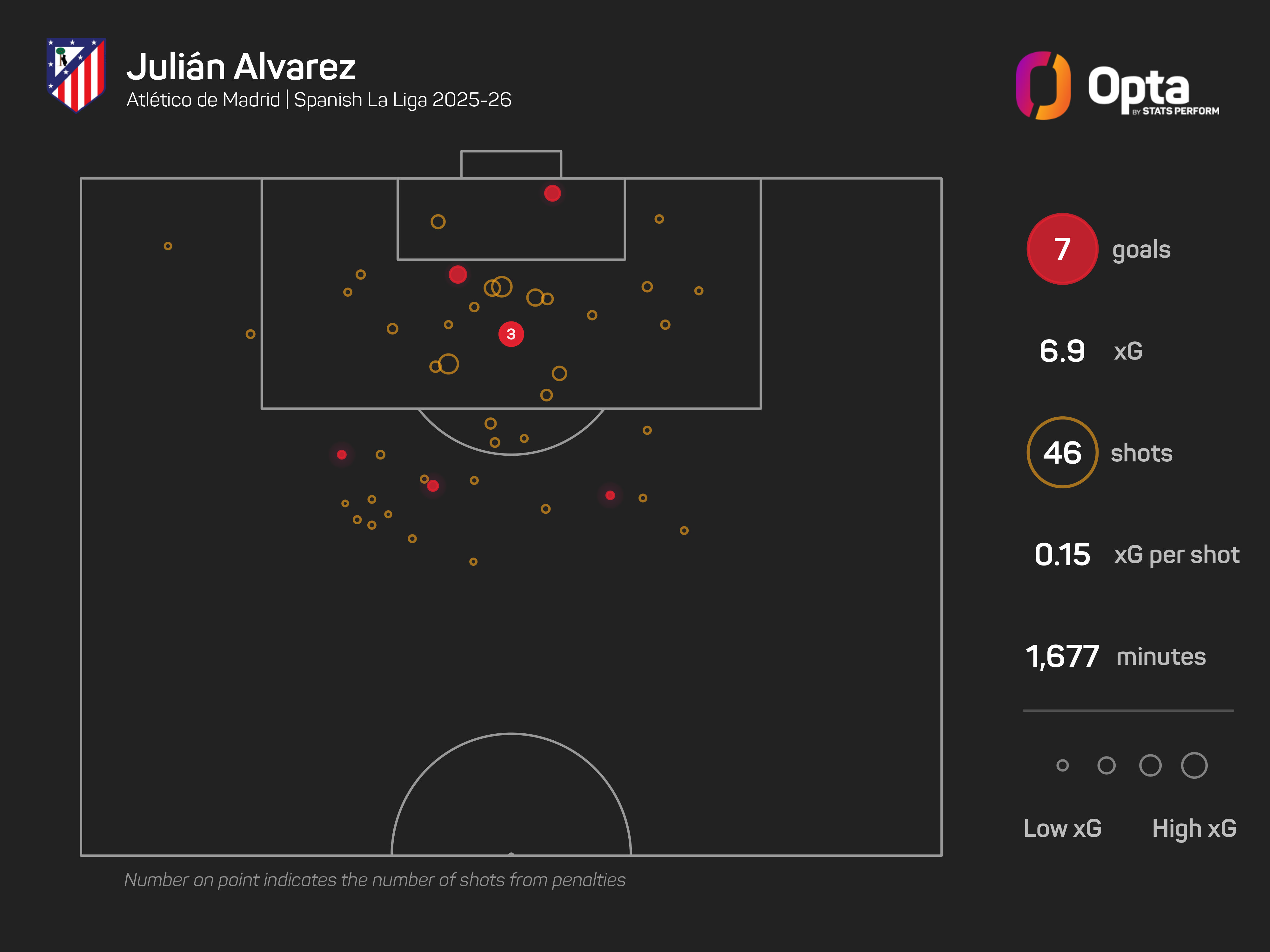 After scoring seven goals in his first 11 games in LaLiga 2025-26 from 15 shots on target, Alvarez has not scored in any of his last 13 matches in the competition, registering just eight shots on target in that period.