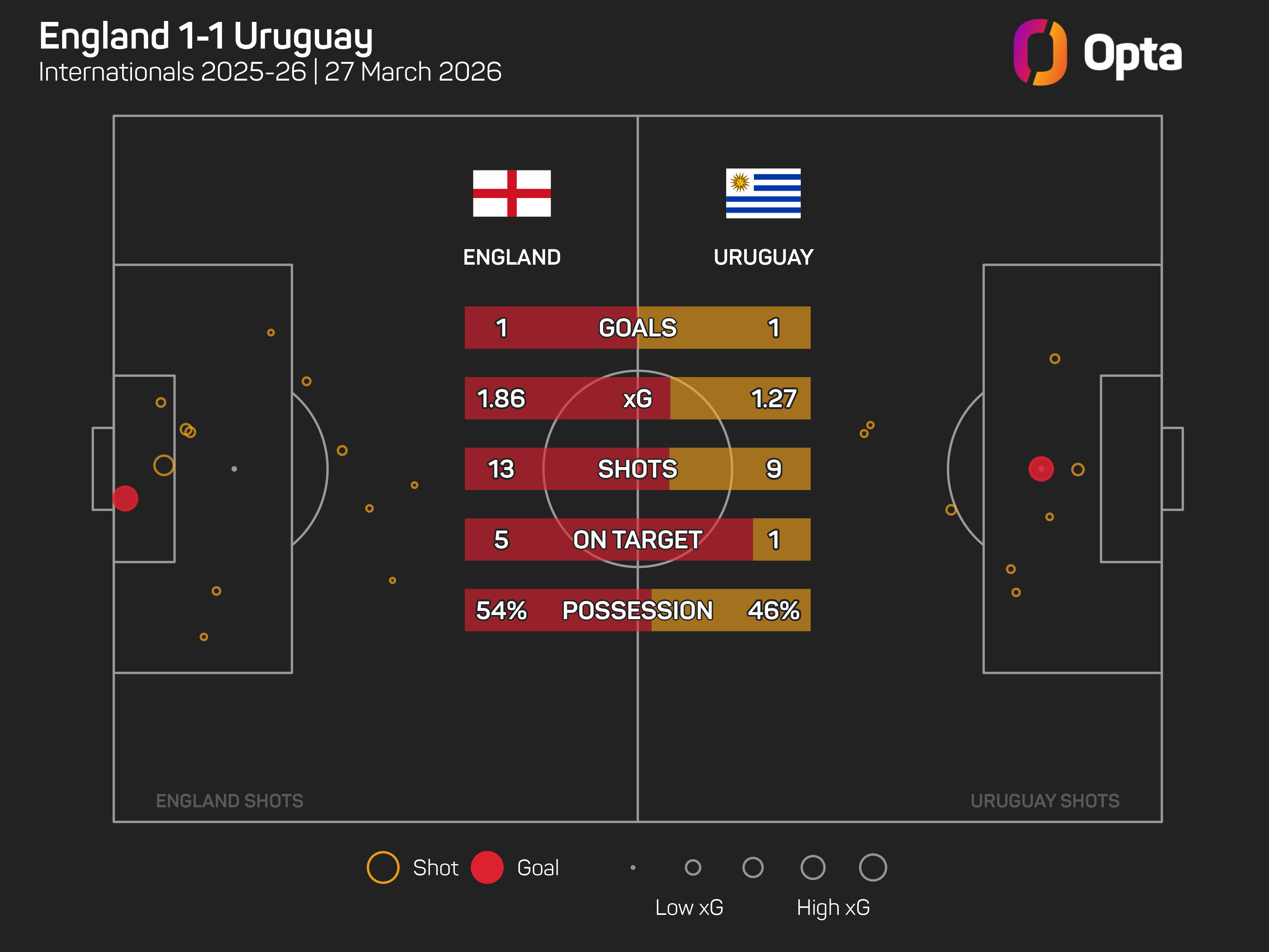 Uruguay's equaliser ended a run of 629 minutes without conceding for England, with Valverde's goal the first they had conceded since June 2025 v Senegal, in a 3-1 defeat.