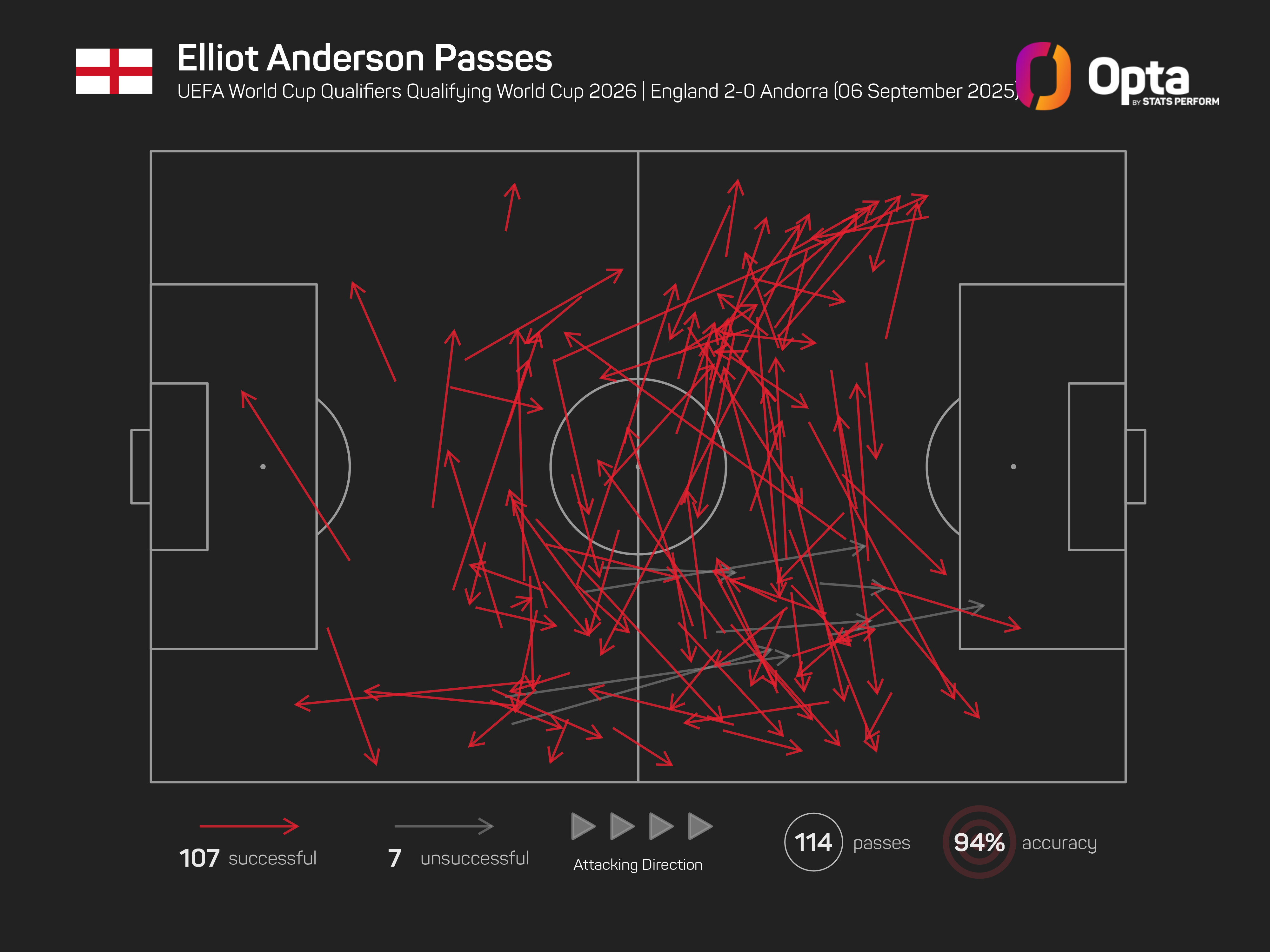 Noni Madueke played in the cross from which Garcia headed in England's opener against Andorra, and the Arsenal winger finished that match with a game-leading three chances created, while he also successfully completed two of his five dribbles.