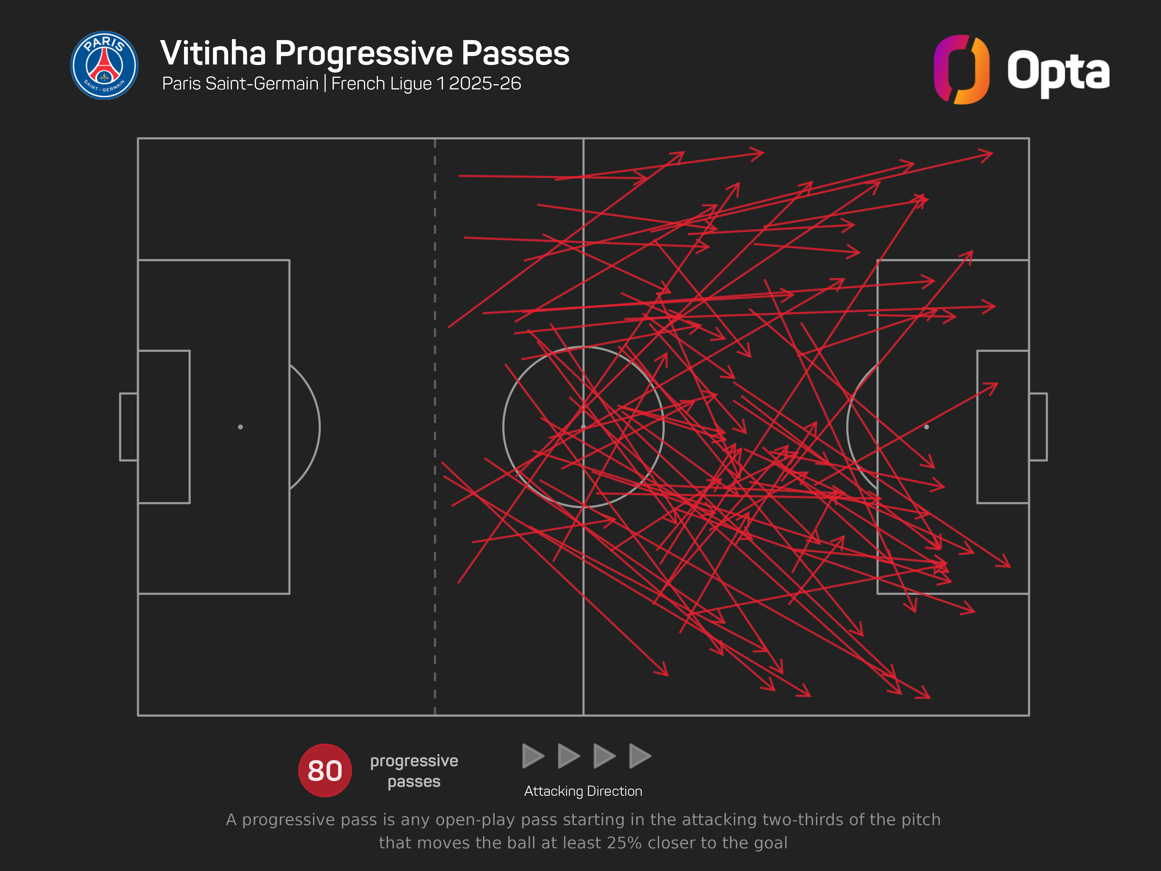 Vitinha is the only player to have made 200+ line-breaking passes in Ligue 1 this season, having made 111 more than any other player (303, 192 for second-placed Moussa Niakhate).