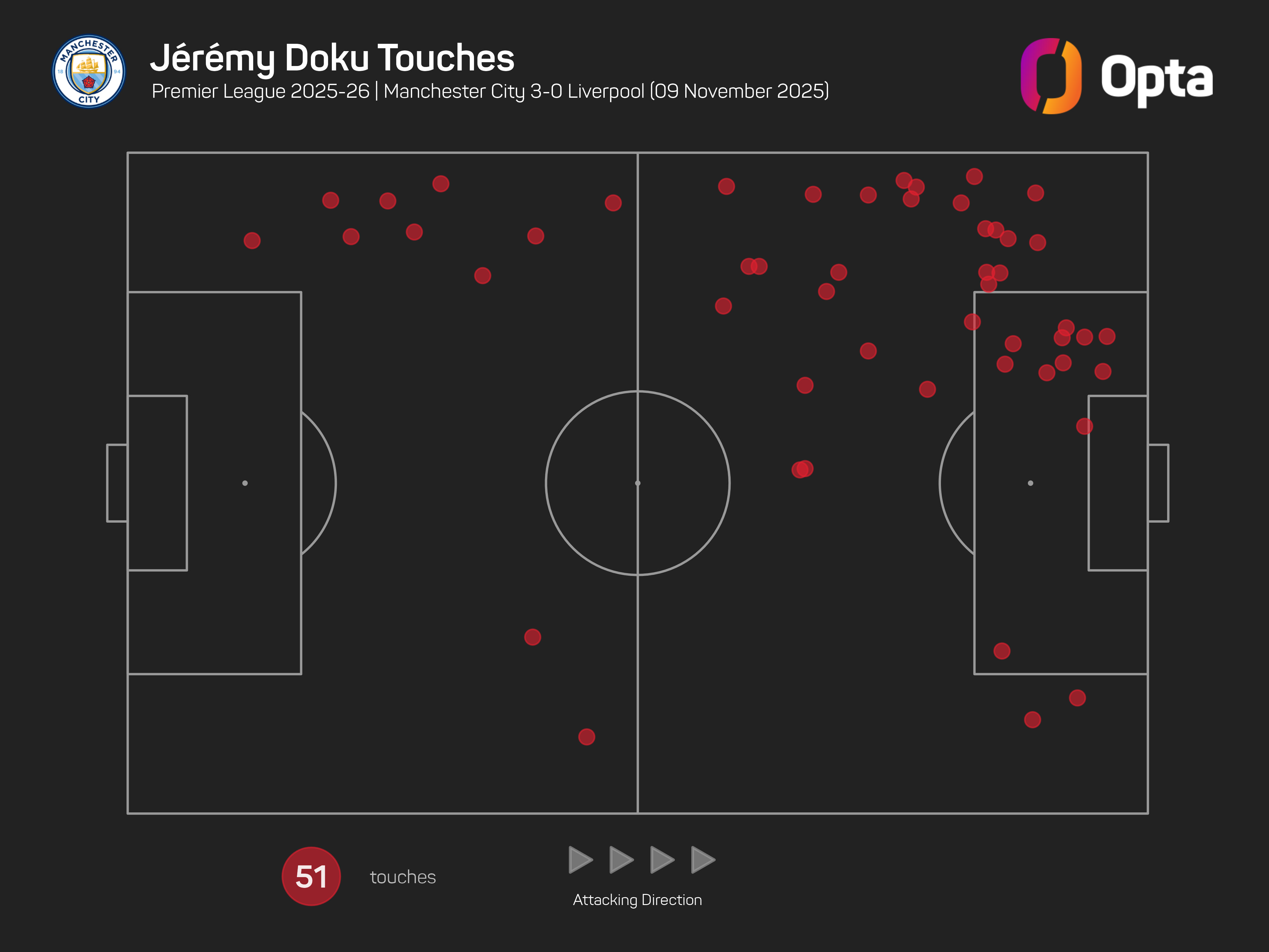 Doku has already registered nine goal involvements (five goals, four assists) this season in all competitions. In each of his previous two seasons at City, he has recorded 15, while tallying six goals in each of 2023-24 and 2024-25.