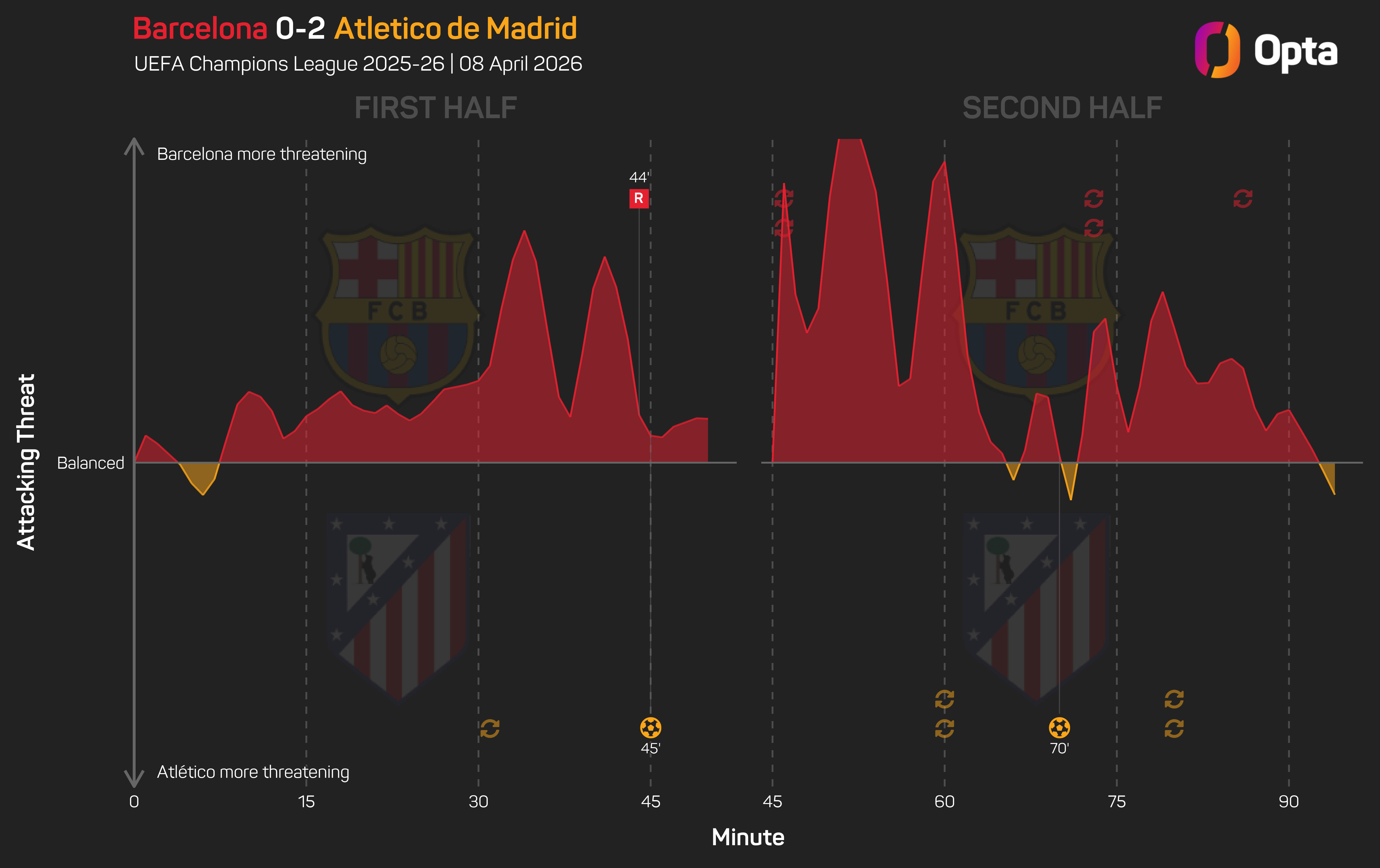 But the game turned on Pau Cubarsi being sent off for a last-man foul at the end of the first half, with Alvarez brilliantly scoring from the resulting free-kick. Hansi Flick's side continued to press even while a man down, but Sorloth's left-footed finish means they have a mountain to climb if they are to avoid a shock exit.
