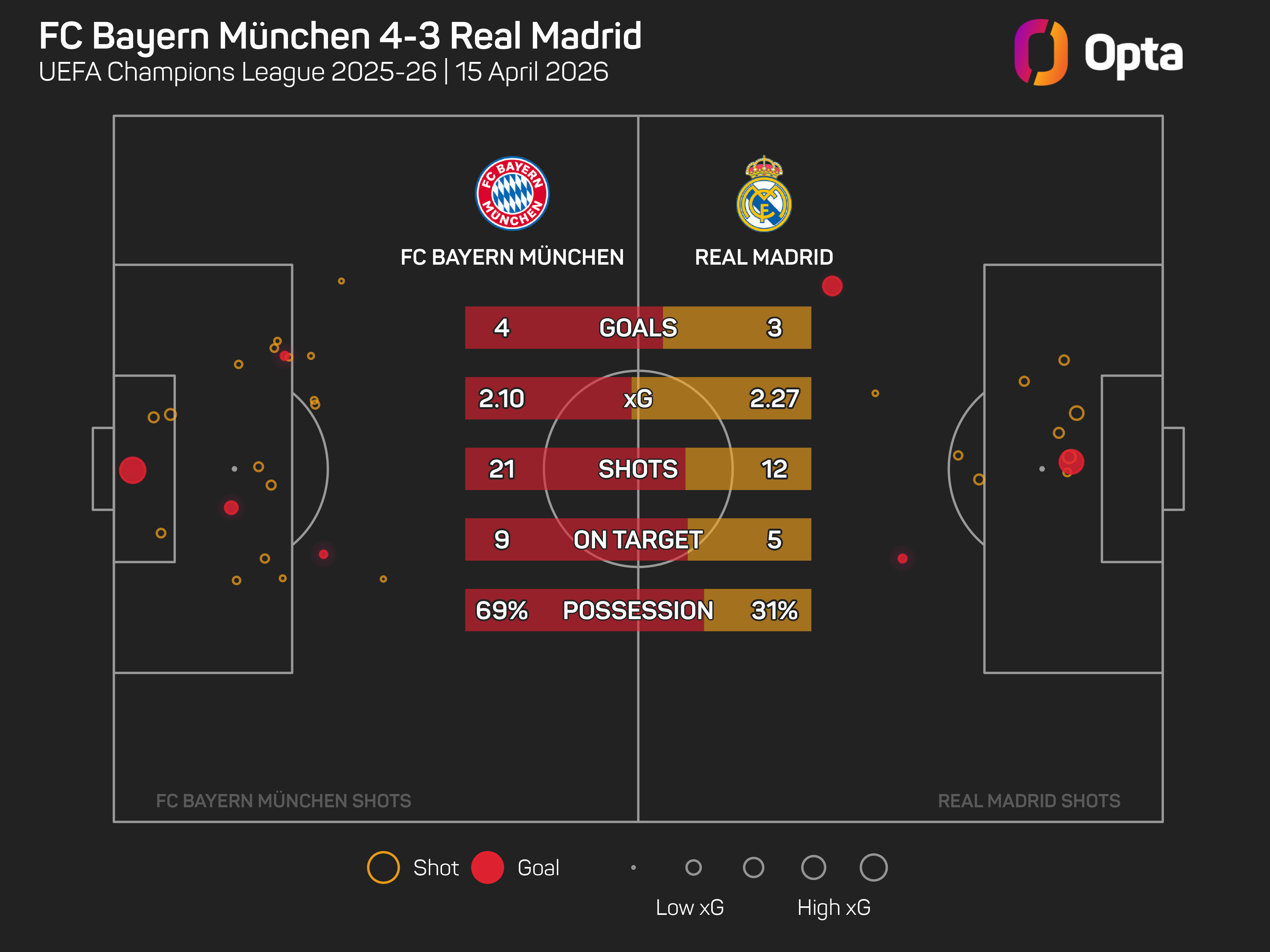 It was 1-1 within six minutes of kick-off – the earliest both teams have ever scored in a Champions League knockout game – after goalkeeping errors from Manuel Neuer and Andriy Lunin, and that set the tone for a chaotic, five-goal first half.