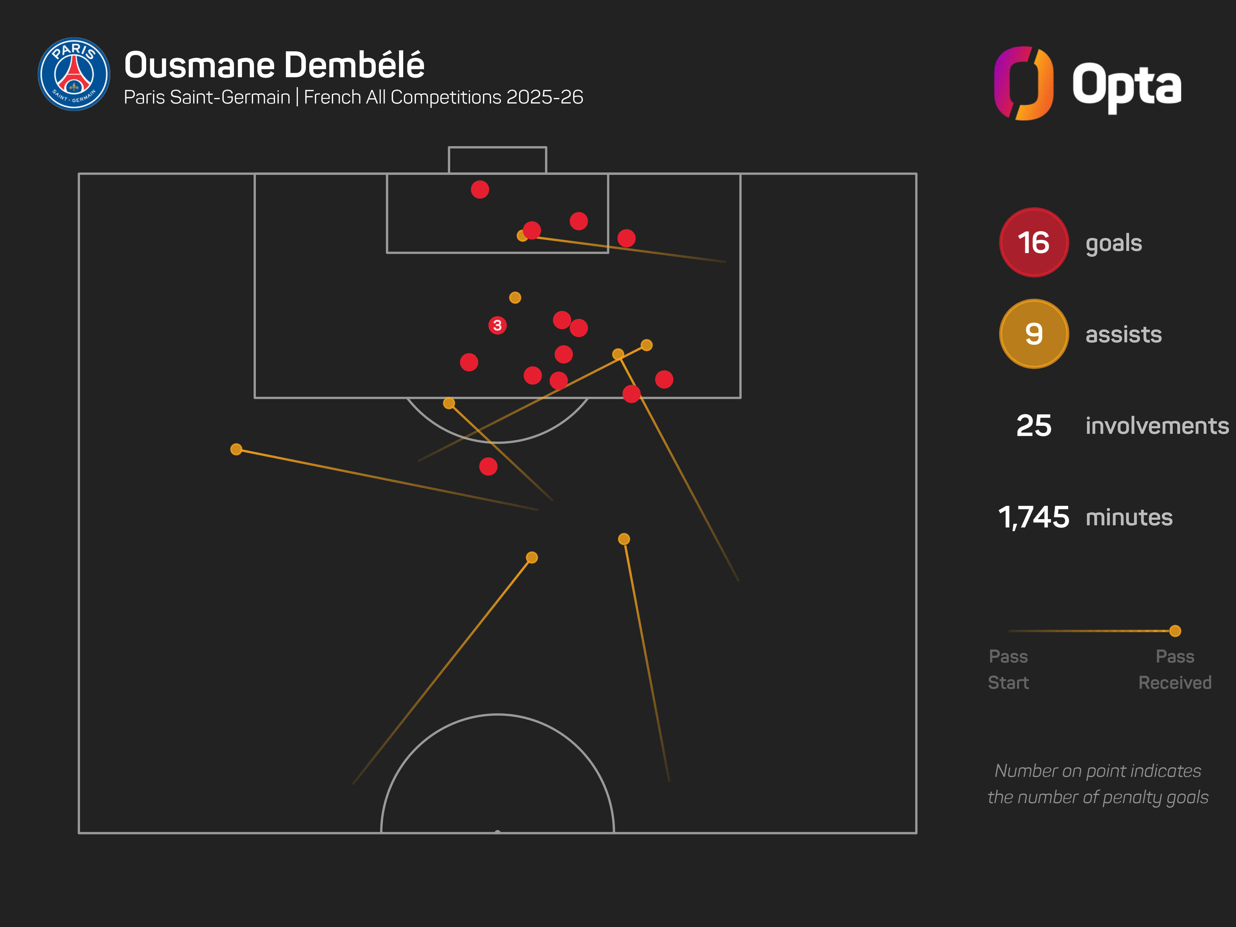 The Frenchman also has nine assists, a tally only bettered by Vitinha (11) and Khvicha Kvaratskhelia (10), while Bradley Barcola (73) has created more chances than his 66.