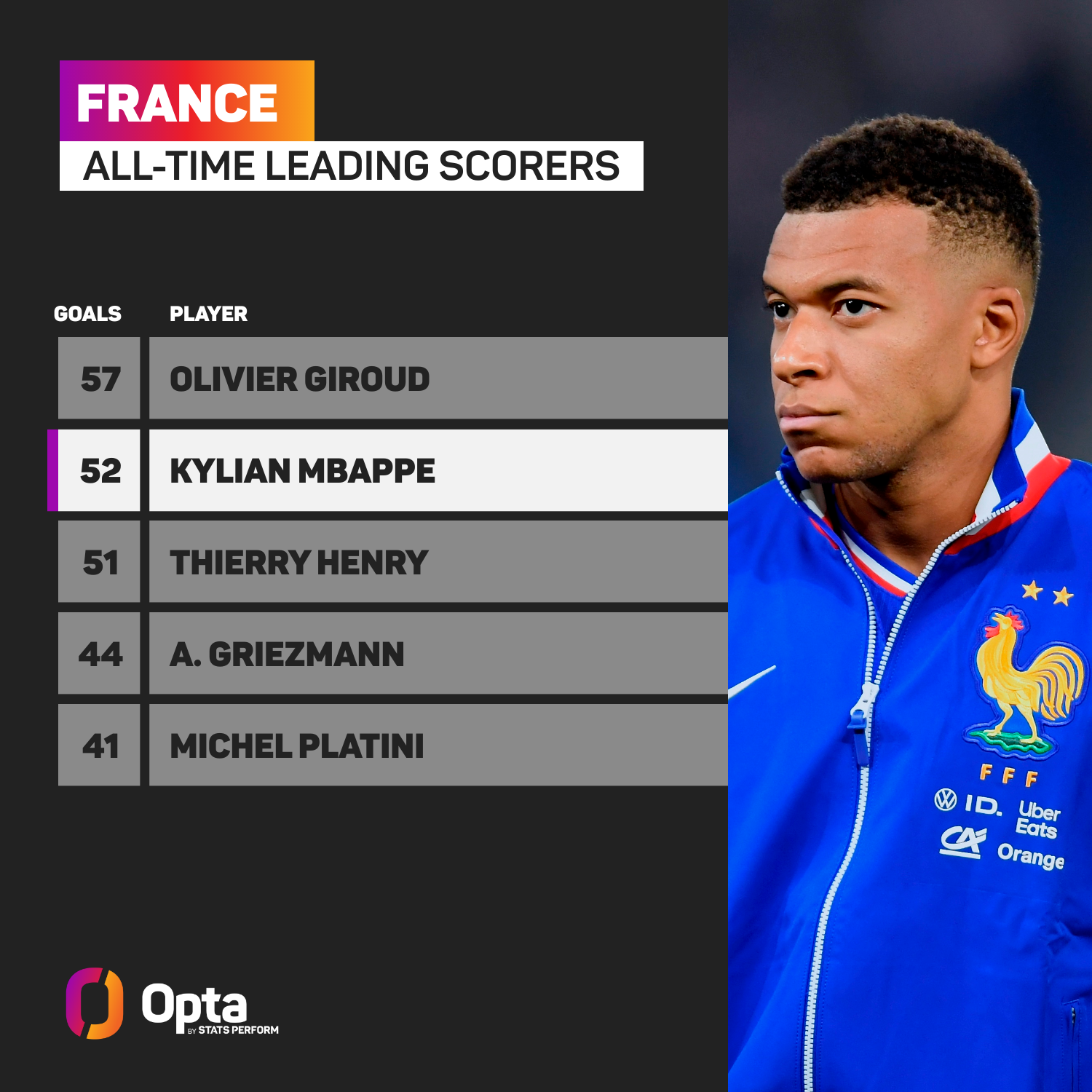 He is five shy of Giroud's all-time Bleus record of 57, having played 48 games fewer for France than his former striker partner did.