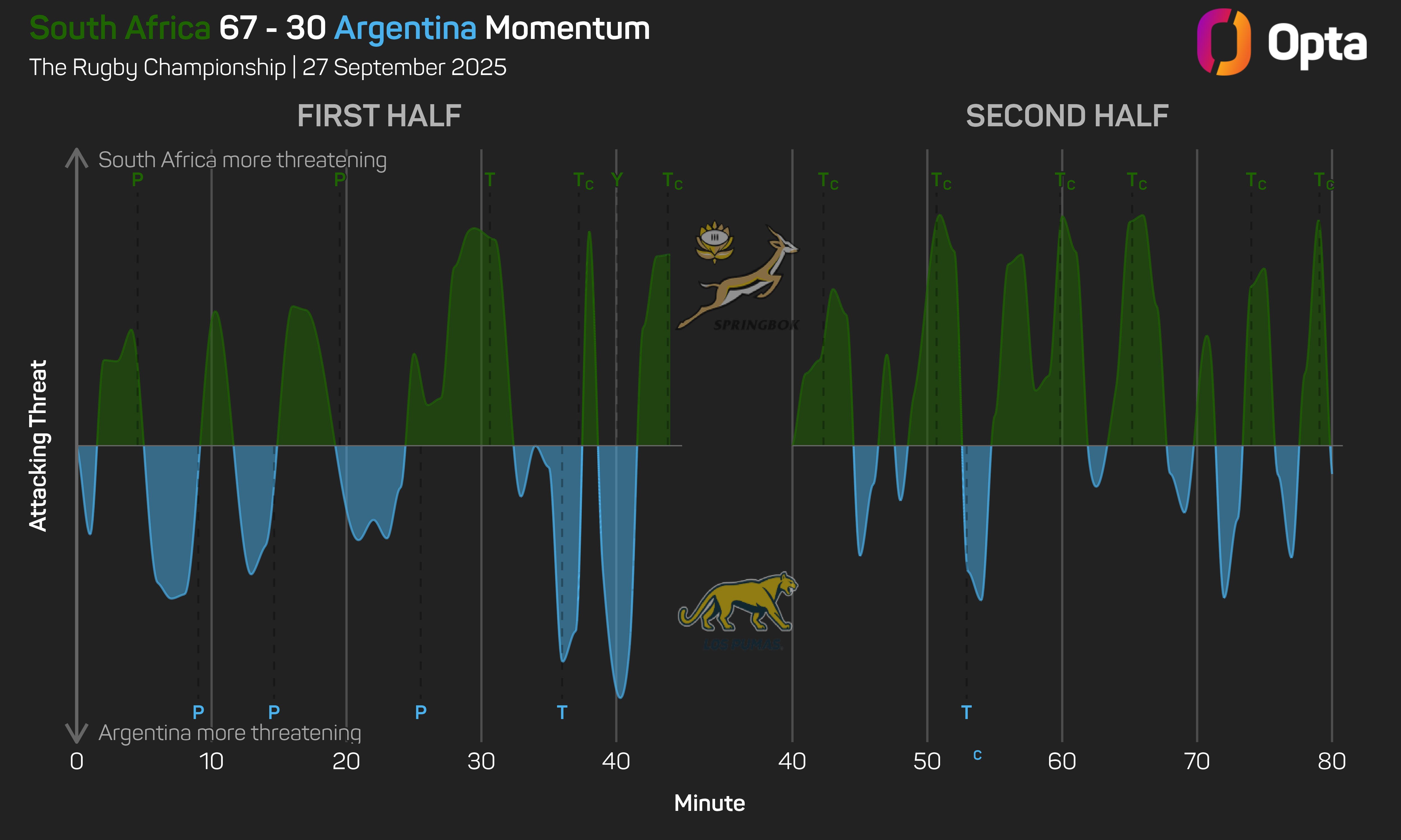 The victory ensured the Springboks jumped ahead of New Zealand in the Rugby Championship standings with 15 points from five games.