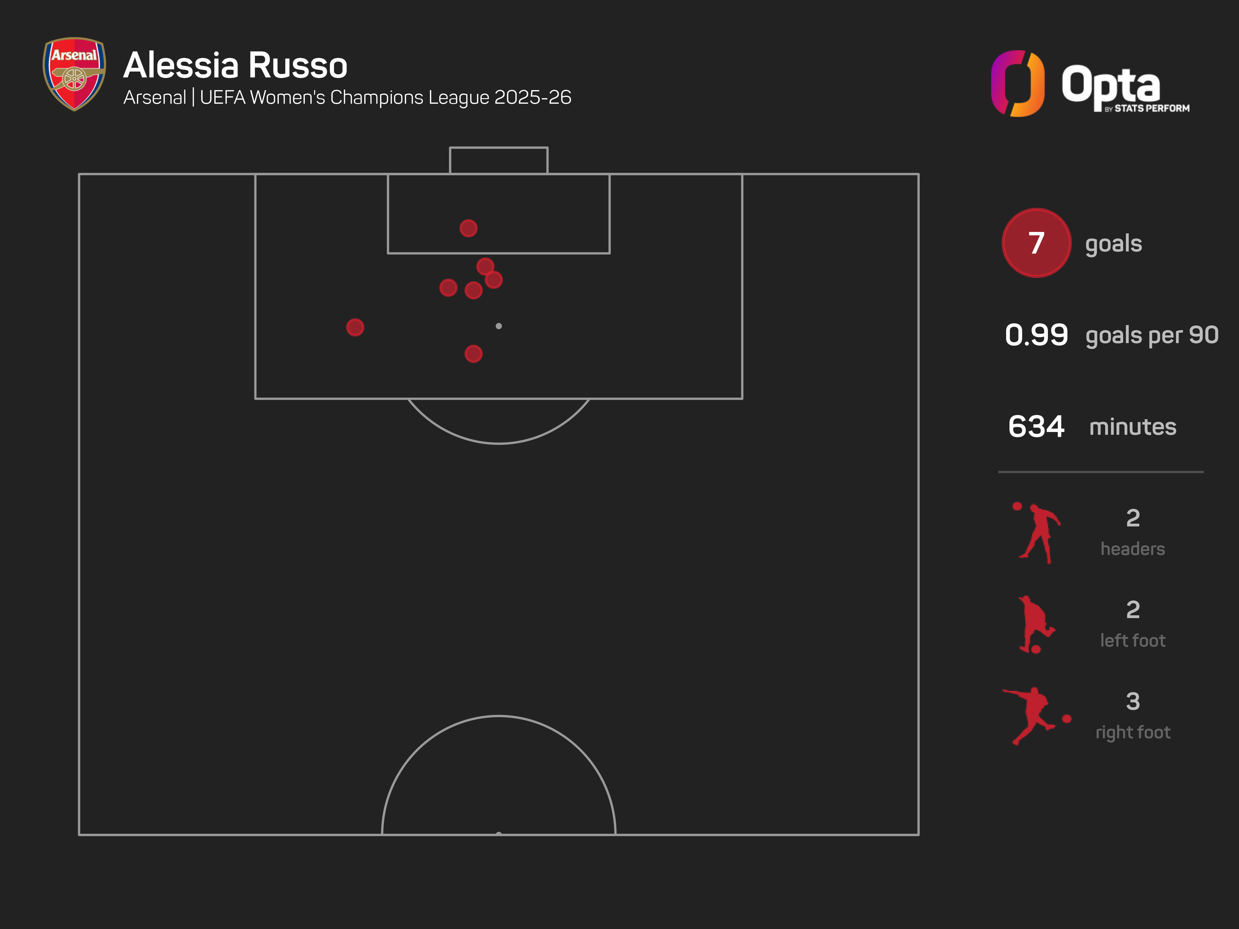But their route to the last eight has been spearheaded by Russo, who is the leading goalscorer in the 2025-26 edition of the Champions League with seven goals.